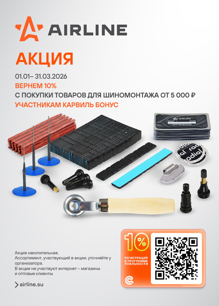 01.01 - 31.03.2026 Акция ПЛ Карвиль Бонус "Вернем 10% с покупки товаров для шиномонтажа от 5 000 ₽ участникам Карвиль Бонус"